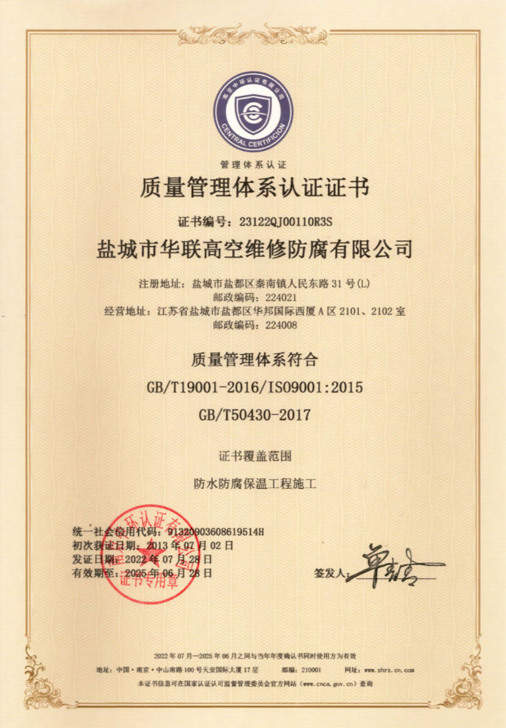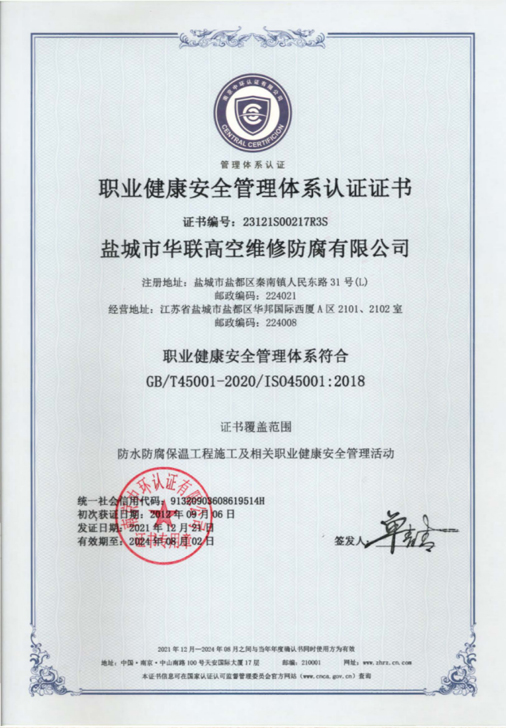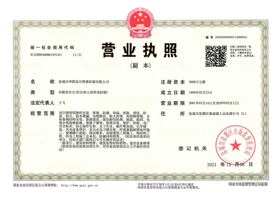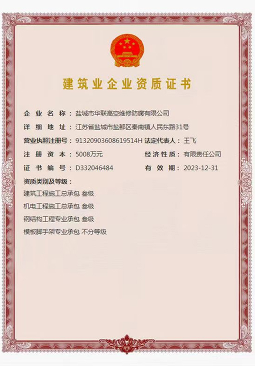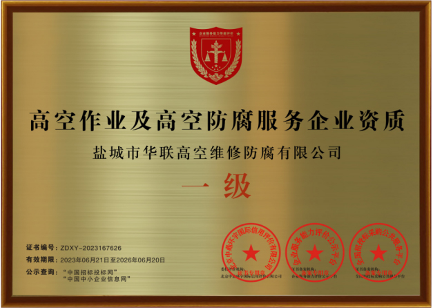 鹽城市華聯(lián)高空維修防腐有限公司始建于上世紀(jì)八十年代,系專業(yè)從事風(fēng)力發(fā)電機(jī)塔筒防腐,塔筒維護(hù),塔筒補(bǔ)漆,塔筒噴字等工程。不停產(chǎn),不搭手架,高空懸吊施工的一級高空安全資質(zhì)、一級高空防腐施工資質(zhì)、二級建筑施工資質(zhì)的高空建修、防腐工程、公司。現(xiàn)已發(fā)展集科研、設(shè)計(jì)、施工為一體的的江蘇省較大的高空建修,高空防腐施工企業(yè);公司注冊資金3008萬元,流動(dòng)資金8000多萬元;擁有高修技術(shù)科研高修工程設(shè)計(jì)、高修工程施工三大技術(shù)與施工組織體系;公司擁有一流的技術(shù)施工隊(duì)伍,其中有高級職稱36 名,中級職稱126人。具備一級防腐資質(zhì)、一級安全資質(zhì)及二級建筑資質(zhì),公司下轄五個(gè)分公司和十八個(gè)辦事處,為全國數(shù)百家企業(yè)解決了若干“高、大、難”的特殊工程項(xiàng)目,填補(bǔ)了我國建筑史上的空白。